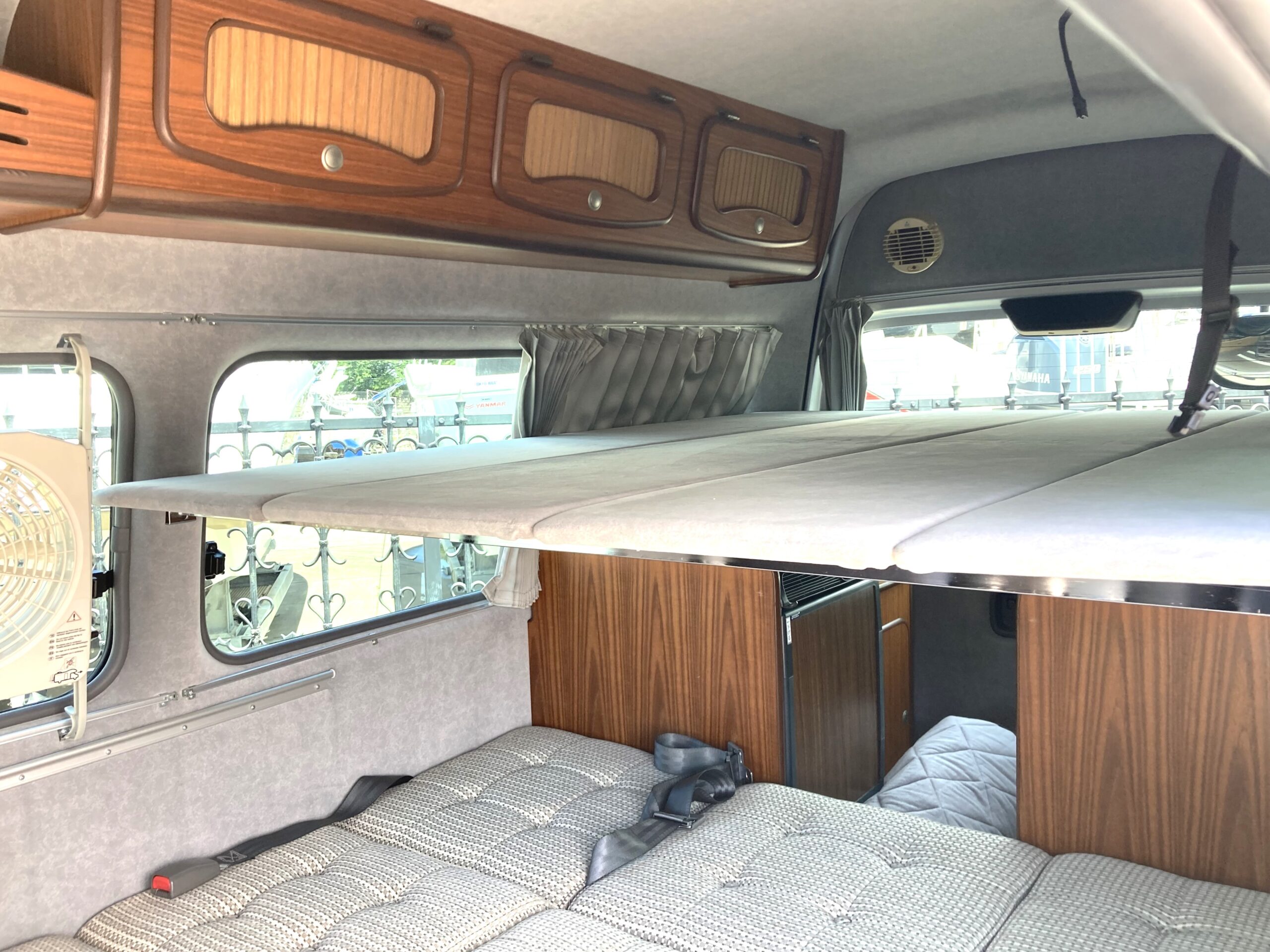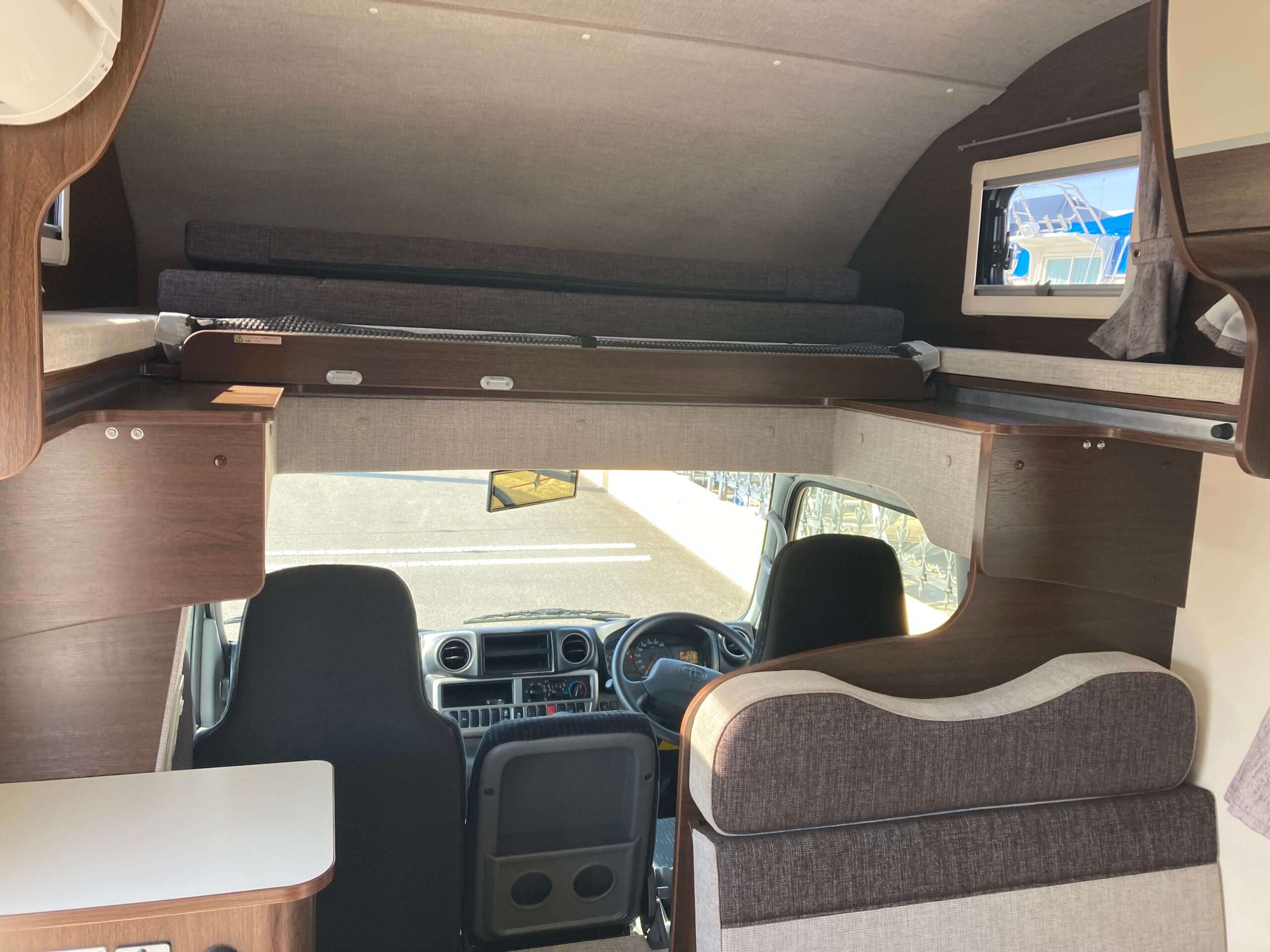 装備※バンクベッド(3名就寝)/ダイネットベッド(1名就寝)/後部2段ベッド(2名就寝)/家庭用エアコン/FFヒーター(サブバッテリー電源)/電子レンジ/冷蔵庫/マックスファンベンチレーター/シンク/カセットコンロ/1,500Wインバーター/AC100V外部電源